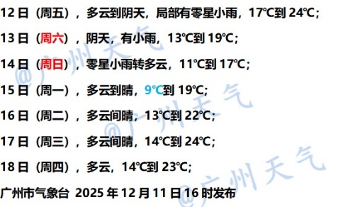 广州市气象台预计,12月12日广州以多云为主,局部有零星小雨。12月13日白天起,中等偏强冷空气自北向南影响广州,气温持续下降并伴有小雨,日平均气温下降5℃~8℃。过程最低气温出现在12月15日早晨:北部6℃~9℃,中部9℃~11℃,南部12℃~13℃。12月13日~14日,广州陆地阵风将加大至5~7级,广州港区和高地阵风加大至6~8级。这次降温先是湿冷,后转晴冷,然后白天就渐渐回暖了。